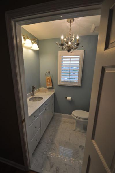 The vanity, under mounted sink, new decorative mirror and lighting by Drumm Design Remodel